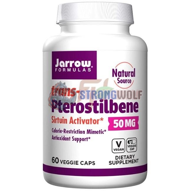 Пищевая добавка от американского бренда Джарроу Формулас содержит транс-птеростильбен (диметил-ресвератрол) в веганских капсулах, в дозировке 50 мг. Количество порций в упаковке: 60