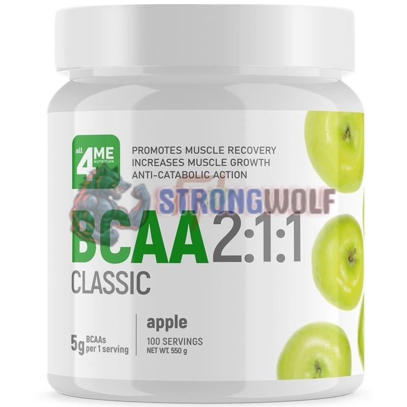 Упаковка содержит 100 порций по 5 гр BCAA в быстрорастворимой форме, с фруктовым вкусом и натуральным подсластителем - сукралоза. Купить All4Me Nutrition BCAA Classic 2:1:1