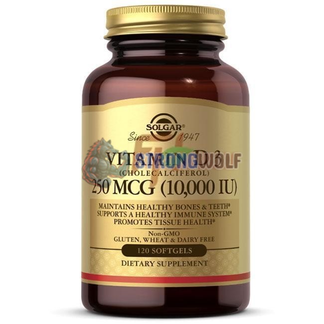 Пищевая добавка от американского бренда Солгар содержит витамин Д3 в форме холекальциферола (из ланолина) в дозировке 10 000 единиц (МЕ)